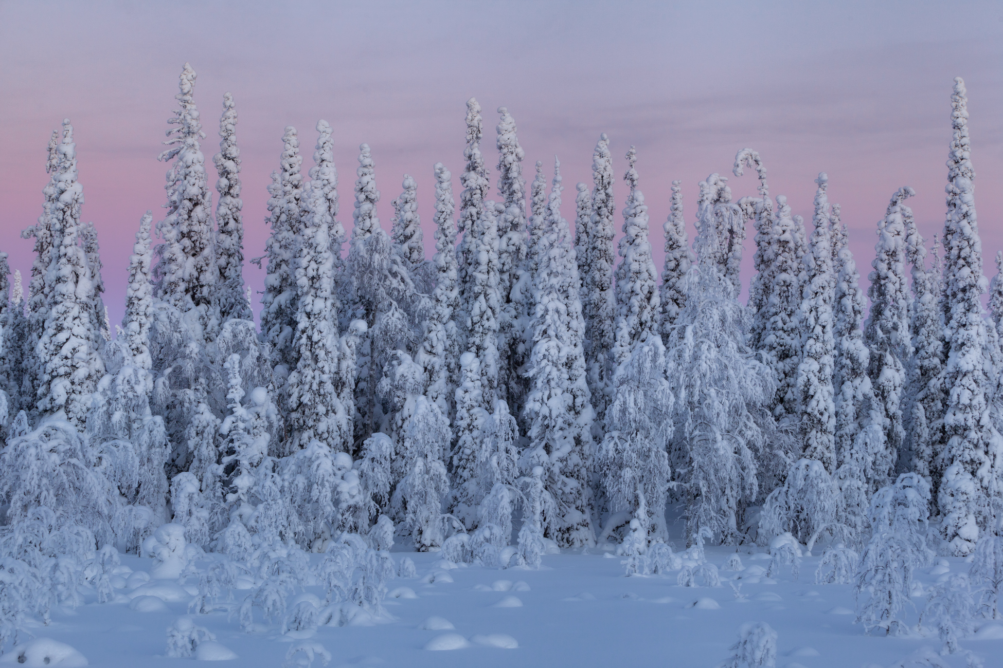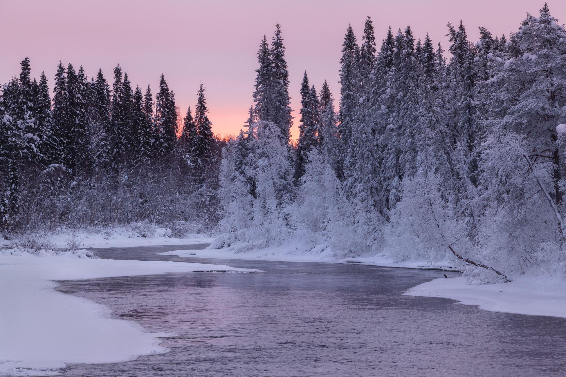 Небо плавно перекрашивалось в розовый цвет. Белые деревья и темная вода Оланги на фоне этих фееричных облаков подарили сумасшедшие по красоте кадры.